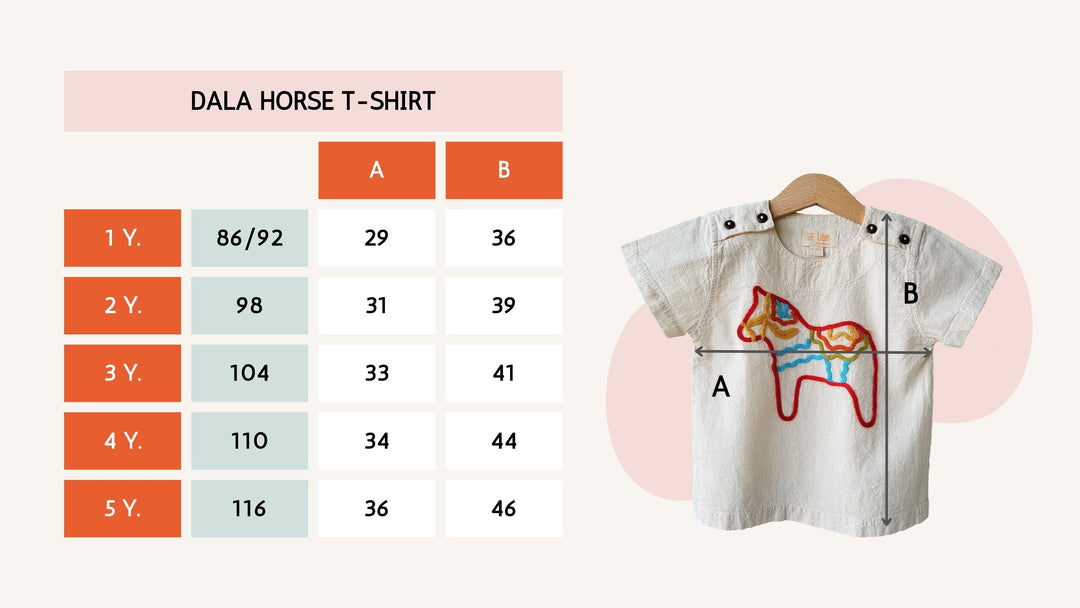 Dala T-shirt är ett löst sittande plagg med kokosknappar. Öppningen på axlarna gör barnet mer bekvämt när det klär ut sig.